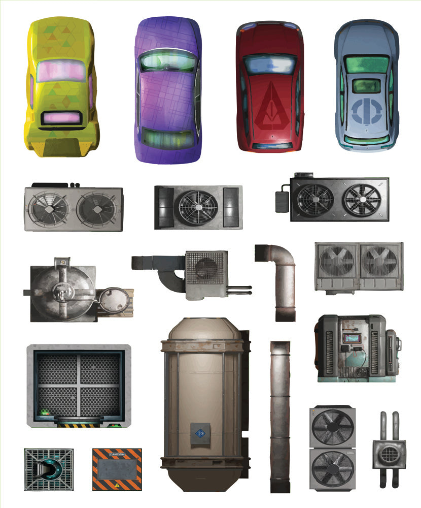 • Variety of scenery types: street furniture and debris, neon signs and holograms, market stalls, vendor carts, barricades and cover, trash piles and graffiti, ventilation units, exposed wiring, alleyway puddles, manhole covers, and more.